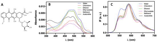 (A) Molecular structure of doxorubicin (C27H29NO11); (B) Absorption spectra of doxorubicin solutions, at 1 × 10−5 M, in several solvents; (C) Normalized fluorescence (at peak of maximum emission) spectra of doxorubicin (1 × 10−6 M, λexc = 480 nm) in several solvents.