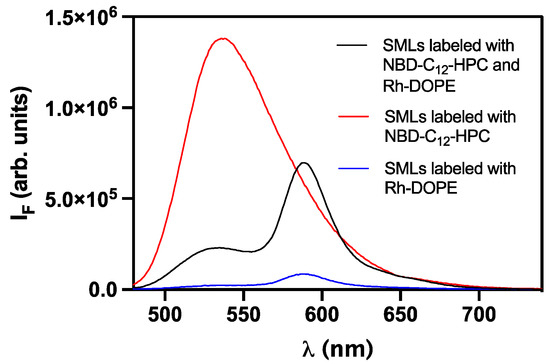 Fluorescence spectra (λexc = 470 nm) of SMLs with a DPPC bilayer labeled with only NBD-C12-HPC, with only Rh-DOPE and labeled with both NBD-C12-HPC and Rh-DOPE.