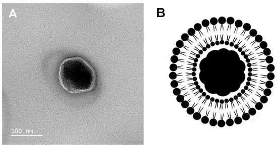 Transmission electron microscopy (TEM) allows characterizing the size and shape of SMLs. Figure 10A exhibits a single solid magnetoliposome, which is characterized by the presence of a nanoparticles cluster, highly contrasting with the bright thin DPPC lipid bilayer involving it. Using ImageJ software for image processing, several different segmented lines along the SML image were taken into account to measure the nanosystem mean diameter, resulting in mean diameter of 116.5 ± 5.5 nm. The same procedure was carried out to estimate the length of the lipid bilayer, resulting in a mean length of 8.3 ± 1 nm, complying with those reported in the literature and the obtained from FRET measurements. A schematic representation of solid magnetoliposomes was drawn from the clear TEM image and is presented in Figure 10B. An additional TEM image, at lower magnification (and different contrast), is presented in the Supplementary Material (Figure S2). The image reveals some dispersity in size, as inferred from DLS measurements (PDI near or above 0.2). It is also clear that the SMLs are not aggregated. The results prove the suitability of the new method here shown to originate magnetoliposomes with a typical structure, consisting of two DPPC monolayers surrounding an inner cluster core (with residual water content) of shape anisotropic nanoparticles.