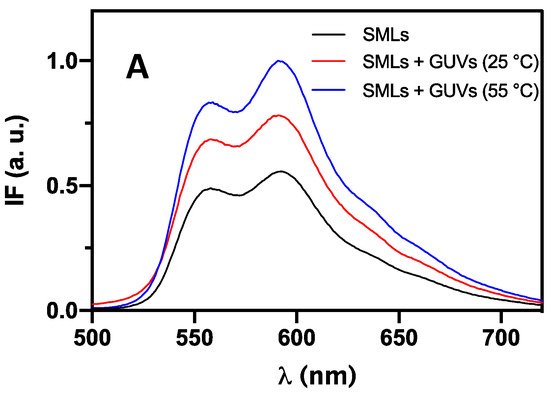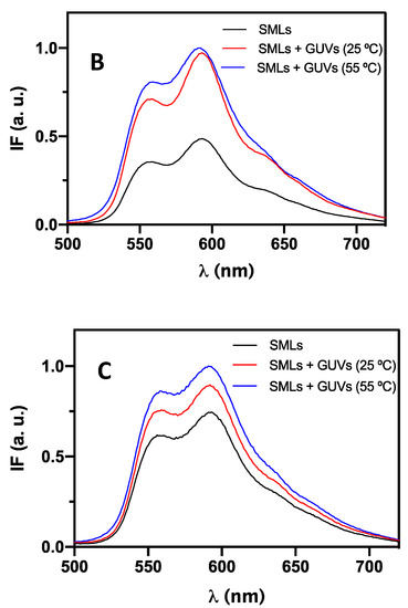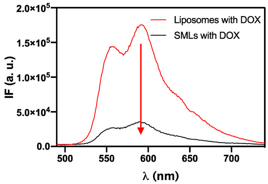 The steady-state fluorescence anisotropy, r, was calculated using Equation (7) to study DOX incorporation in SMLs. Several assays were performed for the different lipid formulations and temperatures.