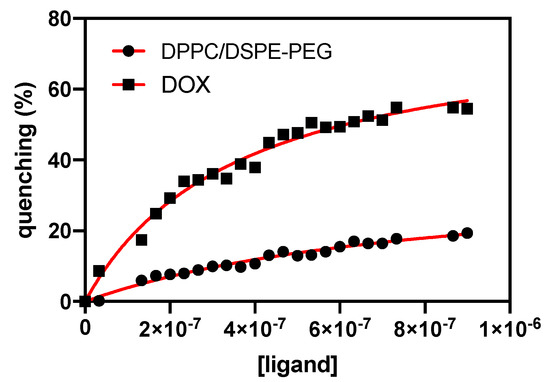 The binding to human serum albumin (HSA) was studied by the titration of a fixed concentration of 0.2 mM of HSA aqueous solution (equivalent to HSA blood plasma concentration) with a freshly prepared aqueous solution containing the ligand (free doxorubicin, DPPC liposomes loaded with doxorubicin, and DPPC/DSPE-PEG liposomes loaded with doxorubicin). The experiment was carried out with liposomes instead of magnetoliposomes, since the presence of magnetic nanoparticles has a quenching effect on HSA fluorescence emission and thus strongly influences the results. In each increment (1 μL of ligand solution), the sample was left stabilizing at room temperature for 30 min. Each assay consisted of selectively measuring the fluorescent emission of tryptophan residues (excitation wavelength at 280 nm). The calculations were based on the changes of maximum fluorescence emission intensity found at 344 nm. The results were expressed by plotting fluorescence quenching of HSA emission as a function of ligands concentration. The emission spectra were recorded in the range of 290–700 nm, with an integration time of 1 s and the width of the slits set to 2 nm. The relative efficiency of HSA quenching can be described by Equation (9) [29],