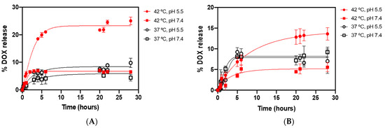 Considering the complexity of cancer cells’ biology and the difficulties found along the treatments, it is essential to integrate combined and synergistic approaches to ensure a more effective, localized, and controlled therapy. The DOX release profiles from DPPC-based and DPPC:DSPE-PEG-based SMLs at different pH values (5.5 and 7.4) and temperatures (37 °C and 42 °C) are presented in Figure 14. For DPPC SMLs (Figure 14A), the results show that the drug release rate is highly dependent on pH and temperature. The release profile at 42 °C and pH = 5.5 stands out compared to the other combinations, exhibiting a burst release of 21.0 ± 0.4% in the initial six hours. The burst release is followed by a linear release phase, presenting a slow and controlled release profile that achieved the maximum release of 25 ± 2% at 28 h. Considering that 42 °C is above the DPPC transition temperature, there was an expected higher release rate at this temperature, considering the increase in permeability of magnetoliposomes membrane, which was verified at pH = 5.5. However, at pH = 7.4, the maximum release percentage is only 6.5 ± 0.2%, which is 3.5 times lower than the values obtained at pH = 5.5. These results provide evidence that acidic pH increases the hydrophilicity of DOX, contributing to an accelerated drug release, that is also verified at 37 °C. At physiological temperature, both pH conditions present slow-release kinetics, achieving a maximum release of 9 ± 1% at pH = 5.5 and 4 ± 1% at pH = 7.4. At physiological pH, DOX is protected by magnetoliposomes, and its release is delayed. In therapeutic conditions, the cardiotoxicity of the anthracyclines is dose-limiting, often leading to heart failure due to dilated cardiomyopathy years after exposure [60]. Willis et al. [61] demonstrated dose-dependent cardiac atrophy in mice at relatively low dose exposure. By delaying DOX release at physiological conditions, magnetoliposomes offer a protective effect over DOX-associated cardiomyopathy and other systemic adverse side effects. Liposomal doxorubicin was associated with a cardiac and gastrointestinal toxicity reduction, while maintaining a similar antitumor efficacy [62]. Recently, Swietch et al. [63] demonstrated that the medium pH has an impact on the affinity of DOX toward the carrier, the protonation of the anthracycline at acidic pH facilitating drug release. In addition, Chai et al. [64] observed an increased release rate of DOX at a decreased medium pH in DOX-loaded poly(lactic-co-glycolic acid) (PLGA) nanoparticles. The authors attributed the results to a strongly pH-dependent solubility, facilitating DOX release at low pH values.