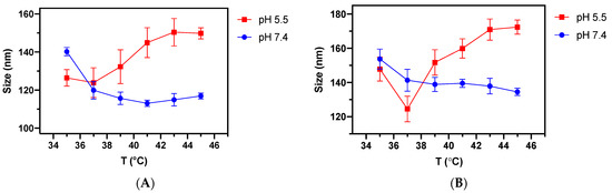 Size variation of DOX-loaded SMLs with increasing temperature at different pH values. (A) DPPC SMLs; (B) DPPC/DSPE-PEG SMLs. Mean size values and standard deviation are from triplicate assays.