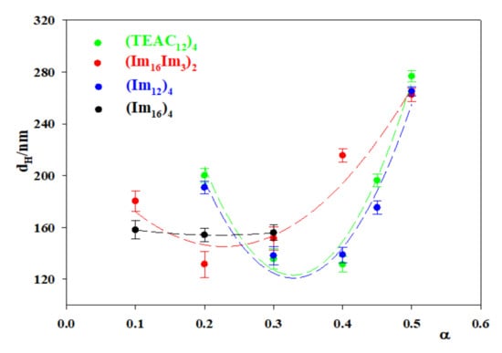 | α | dH/nm a | PDI a | dH/nm b | PDI b |