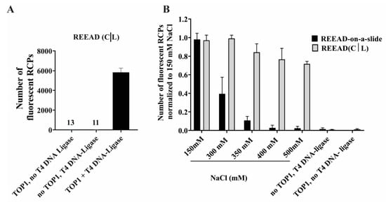 REEAD (C|L) enables separate investigation of the binding/cleavage or the ligation steps of the TOP1 catalytic cycle. (A) Graphical depiction of the number of fluorescent RCPs obtained by REEAD (C|L) performed in the absence of T4 DNA ligase or TOP1 or in the presence of both enzymes. The error bars represent the average of three independent experiments. (B) Salt titration of the REEAD-on-a-slide or the REEAD (C|L). In the REEAD-on-a-slide assay (black bars), increasing NaCl concentrations (as indicated) were added during the incubation of TOP1 with the dumbbell substrate. In the REEAD (C|L) (grey bars) increasing NaCl concentrations (as indicated) were added specifically during the ligation step. Two negative controls were included, one without TOP1 for both REEAD and REEAD (C|L) and one without T4 DNA-ligase for REEAD (C|L). The number of fluorescent RCPs was counted using Image J and normalized to the highest number of fluorescent RCPs obtained at 150 mM NaCl. Error bars represent standard deviation of four independent experiments.