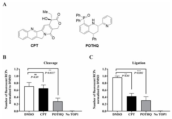 To address if REEAD (C|L) can be used to dissect which steps of TOP1 catalysis are affected by small-molecule compounds, we measured the effect of the well-known TOP1 poison CPT [3,10] (Figure 3A, left) and the less characterized TOP1 inhibitor POTHQ [33] (Figure 3A, right) on the separate binding/cleavage and ligation reactions assayed as described above. In total, 50 μM of either of the two compounds or 5% of the solvent DMSO (corresponding to the content of the DMSO in the two test samples) were added to the reaction mixtures either during the cleavage step or during the ligation step of REEAD(C|L). Subsequently, the number of signals was quantified, and the results depicted as bar charts shown in Figure 3. As evident from Figure 3B, the addition of CPT did not affect the binding/cleavage reaction relative to the DMSO control, whereas POTHQ caused an ~50% reduction in the number of signals obtained under the assay conditions used. When the compounds were added during the ligation step, on the other hand, we did observe an ~60% reduction in TOP1 generated signals in both cases (Figure 3C). The pattern of inhibition observed for CPT is in accordance with the poison mechanism of action of this drug reported in the literature [36,37] and the ability of CPT to introduce nicks in supercoiled plasmids in the presence of TOP1 due to the selective inhibition of ligation (Supplementary Figure S1). The dual inhibition of POTHQ of both the binding/cleavage and ligation steps suggests that this compound acts as an inhibitor of the overall TOP1 activity. This is consistent with the previously reported ability of this compound to inhibit relaxation [33] and the lack of accumulation of nicks induced in supercoiled plasmid by this compound in combination with TOP1 (Supplementary Figure S1). Taken together the obtained results demonstrate the feasibility of REEAD (C|L) to dissect which steps of TOP1 catalysis are affected by a given small-molecule compound. Note, that the degree of inhibition can be analyzed in more detail by performing kinetics. However, this is not the scope of the current study that merely aims to demonstrate the applicability of the assay setup.