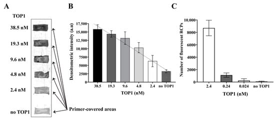 The REEAD (C|L) presents a convenient method for dissecting the effect of potential novel anti-parasitic or anti-cancer small-molecule drugs that target TOP1. However, the microscopic readout utilized to obtain single-molecule resolution is unnecessary for drug screening purposes. Indeed, it may be tedious and require access to a fluorescence microscope, which is not possible for all laboratory setups. Therefore, we here investigated an alternative readout based on a simple colorimetric method that does not require special equipment. In this setup, biotinylated nucleotides are incorporated during RCA. This allows for subsequent coupling of streptavidin functionalized gold nanoparticles that support silver precipitation as described in Section 2.7. The silver-on-gold precipitation results in a dark pigmentation that is directly visible by the naked eye and that can easily be documented by a cell phone camera or standard gel documentation equipment. Like the fluorescence microscope dependent readout, the silver-on-gold precipitation provides a directly quantitative measure as demonstrated by the TOP1 titration experiment shown in Figure 4A,B. In this experiment, decreasing concentrations of TOP1 ranging from 38.5 to 2.4 nM were assayed by REEAD-on-a-slide. The results were visualized using the silver-on-gold precipitation readout and quantified by densitometry (Figure 4A,B). For comparison, circles obtained by incubation of the dumbbell substrate with 2.4 to 0.024 nM of TOP1 were amplified without biotinylated nucleotides and the RCPs visualized by fluorescence microscopy and counted following standard protocol (Figure 4C). As evident from the graphical depiction of the results (Figure 4B,C), both readout methods showed a linear relationship with the TOP1 concentration. The detection limit of the fluorescent readout was 20 orders of magnitudes better than that of the colorimetric readout (compare Figure 4B,C). However, for drug screening purposes using cell extracts or (partly) purified TOP1 this should not matter and can be adjusted for, simply by adding more enzyme.