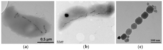 These ferrimagnetic nanochains can be found in prokaryotic microorganisms, such as magnetotactic bacteria as first described by Salvatore Bellini in 1963 [18]. The first report on iron biomineralization in magnetotactic bacteria was given by Blakemore half a century ago [19]. These bacteria can be magnetically isolated and the existence of their ferrimagnetic magnetite particles in the so-called “magnetosomes” was confirmed by different techniques, including transmission electron microscopy (TEM).