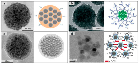 TEM images and corresponding schematic illustrations of synthesized magnetically guidable nanoparticle clusters. (a) Composite magnetic nanoparticle cluster composed of superparamagnetic maghemite nanoparticles and biocompatible polymer [85] (b) One-pot solvothermal synthesis of clusters composed of many superparamagnetic magnetite nanoparticles. Adapted with permission from [84] Copyright 2007, with permission from Wiley. (c) Emulsion/evaporation-based clustering of hydrophobic maghemite nanoparticles following silica coating. Reprinted from [29], Copyright 2014, with permission from Elsevier. (d) Chemical cross-linking method of differently functionalized superparamagnetic maghemite nanoparticles forming synthesized magnetically guidable nanoparticle cluster, adapted from [42]. CC BY 4.0 license.
