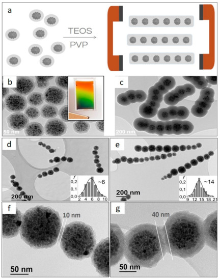 As demonstrated in the last paragraph, different research groups are able to synthesize superparamagnetic nanochains composed of nanoparticle clusters with outstanding properties, although the nanochain lengths always exceed 1 µm. This feature seriously limits their potential use in vivo for medicine, because it is broadly accepted that an ideal length should be in the nanoscale range. Our group has demonstrated a facile and dynamic approach for the synthesis of nanochains with submicron-scale length (Figure 7) [28]. We showed a versatile and flexible approach based on the simultaneous magnetic assembly and stirring-induced disassembly of nanoparticle clusters into nanochains of well-defined lengths. The magnetic-field induced assembly of nanochains was temporarily stabilized with bioinspired polyvinylpirrolidone (PVP) backbone and fixated by the deposition of an additional silica layer. This innovative approach enabled an excellent length control for the short nanochains composed of less than 20 nanoparticle clusters (Figure 7c–e). It was demonstrated that the nanochain length could be controlled, thanks to a fine interplay among different synthetic parameters, such as the time for which the suspension was exposed to a magnetic field, the PVP concentration, the magnitude of the magnetic field, the clusters’ volume fraction, the stirring rate, and the magnetic-field exposure time. Notably, this approach allows also for the fine-tuning of the spacing between adjacent particles inside individual nanochains, through the simple control over the thickness of the primary silica shell on the assembled particles (Figure 7f,g). It is worth noting that the initial nanoparticle clusters need to form a highly stable colloidal suspension, in order to obtain such control over all the crucial synthetic parameters. Interestingly, the suspension of such nanoparticle clusters is basically the magnetically tunable photonic crystalline liquid, which gives rise to a structural color when exposed to the weak external magnetic field (insertion in Figure 7b) [99].