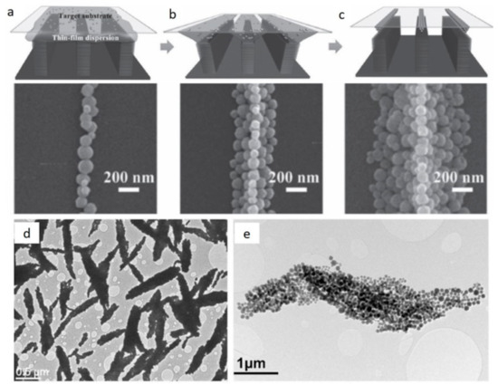 (a–c) Schematic illustration of a method for fabricating striped patterns of magnetic nanoparticles. (a) Template consisting of elongated ridges and gaps, and a flat target substrate. (b) After suspension deposition, water is evaporated and the film is divided in the sections along the ridges of the template. (c) 1D arrangement of the nanoparticles. Reproduced with permission from [107], Copyright 2016, with permission from Wiley. (d,e) Colloidal approach for the magnetic structuring in suspension. Reproduced with permission from [28], Copyright © 2021, with pemission from American Chemical Society. (d) Low-magnification TEM image of anisotropic magnetic nanobundles composed of superparamagnetic nanoparticle clusters, and (e) TEM image of one magnetic nanobundle.