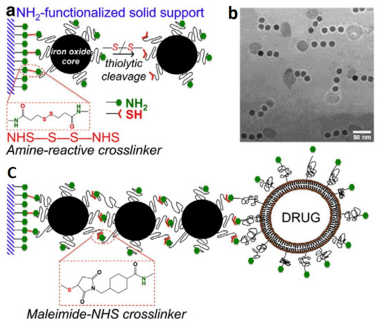 Reaction scheme of the controlled assembly of magnetic nanochains using solid-phase chemistry. (a) Precise control over the chemical functionality of amines and thiols on the surface of individual magnetic nanoparticles. (b) TEM image of fabricated nanochains, each one composed of three units of nanoparticles. (c) Schematic illustration of a multi-step process to produce nanochains with a terminally bonded liposome drug carrier. Reproduced from [110], Copyright 2013, with permission from Elsevier.