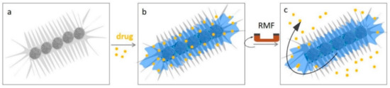 Future application of multifunctional short nanochains carrying drug molecules. (a) Schematic representation of short nanochain with radially aligned pores on the surface, whose design and production has recently been described [39]. (b) Schematic representation of drug-loaded nanochains. (c) Drug release can be triggered through exposure to a rotating magnetic field (RMF). Reproduced from [39] under a Creative Commons license.