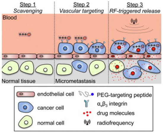 Schematic presentation of therapeutic anticancer approach based on nanochains following three steps. (1) Short nanochain loaded with drug circulates in the blood. (2) Nanochains’ target micrometastases. (3) Radiofrequency-triggered drug release from the nanochains. Reproduced from [110] Copyright 2013, with permission from Elsevier.