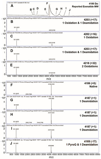 Identification (with deconvoluted masses) of exenatide’s chemical impurities by reverse-phase liquid chromatography-mass spectrometry (QToF) following incubation (pH 8.5) at 60 °C for 24 h. Reverse phase liquid chromatography C4 UV absorbance (A) total ion chromatograms and (B–E,G–J) exenatide chemical impurities and their reported respective mass shifts, which include a combination of oxidation, deamidation and PyroQ impurities, from (F) native exenatide’s MW of 4186 Da.