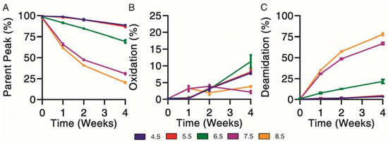 Chemical degradation profiles were determined for exenatide solutions reconstituted between pH 4.5–8.5 that were subject to incubation at 37 °C for 4 weeks. Exenatide’s parent peak was separated from its chemical impurities on a reverse-phase liquid chromatography column. Parent peak (Figure 2A), oxidation (Figure 2B) and deamidation (Figure 2C) impurities were quantified over the course of incubation. When incubated at pH 4.5 and 5.5, the parent peak remained relatively stable, decreasing to 88.6 ± 0.7% and 87.0 ± 1.4%, after 28 days of incubation, respectively. The relative stability of exenatide at low pH was expected as Byetta® is commercially formulated in an acetate buffer solution at pH 4.5. On the other hand, rapid, pH-dependent degradation of exenatide was observed at pH 6.5, 7.5 and 8.5. We also observed a loss of total AUCs, indicating some precipitation occurring at pH 7.5 and 8.5 after 2 and 4 weeks, decreasing to 71.9 ± 10.1% and 70.9 ± 9.8% relative to day 0, respectively (Supplementary Material Figure S1B).