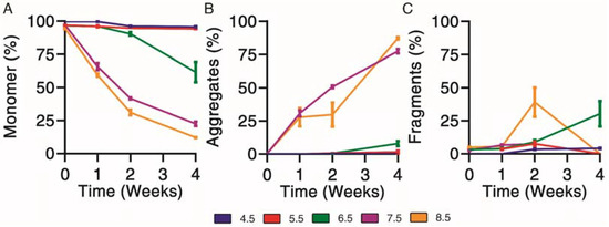 Kinetics of physical degradation determined by size exclusion chromatography, separating (A) monomer from (B) aggregate and (C) fragment physical impurities of exenatide reconstituted at pH 4.5–8.5 after incubation at 37 °C for 4 weeks. (n = 3, mean ± SEM).