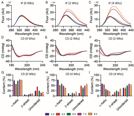 Structural and conformational changes characterized and measured by (A–C) intrinsic fluorescence and (D–F) circular dichroism, with secondary structures (G–I) quantified by CDPro analysis (n = 3, mean ± SEM) for exenatide that was reconstituted at pH 4.5–8.5 after incubation at 37 °C for 4 weeks.