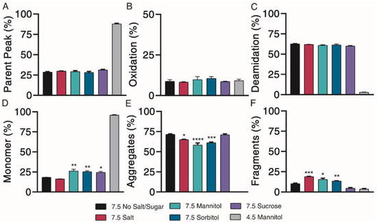 Kinetics of degradation determined by reverse-phase and size exclusion chromatography, with reverse-phase liquid chromatography separating (A) parent peak from (B) oxidation and (C) deamidation chemical impurities and size exclusion chromatography separating (D) monomer from (E) aggregate and (F) fragment physical impurities of exenatide reconstituted at pH 4.5 with mannitol and pH 7.5 with specified excipients after incubation at 37 °C for 4 weeks. (n = 3, mean ± SEM, * p < 0.05 ** p < 0.01 *** p < 0.001 **** p < 0.0001).