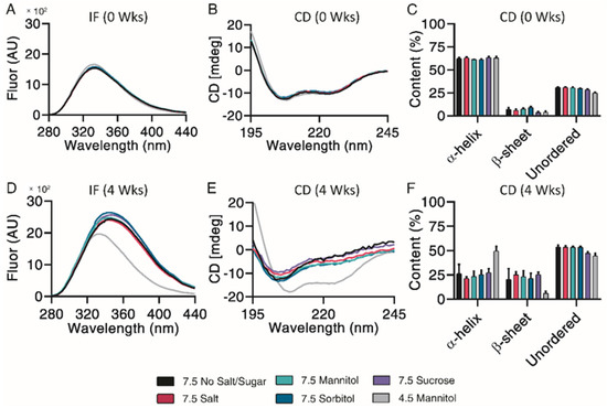 Subsequent structural analysis was performed by intrinsic fluorescence and circular dichroism. All pH 7.5 formulations experienced a large red shift of maximum emission wavelength and increase in maximum fluorescence intensity after 4 weeks, indicative of Trp-cage unfolding (Figure 6A,D). CD Pro analysis showed no observable differences over the incubation (Figure 6B,E). All pH 7.5 formulations contained similar percentages of α-helix, β-sheet, and unordered content both initially and after 4 weeks of incubation (Figure 6C,F). Taken together, mannitol, sorbitol and sucrose exhibited a minor protective ability to prevent monomer loss and control particle sizes.