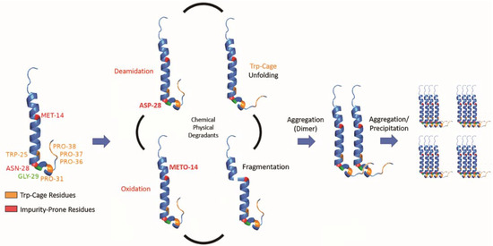 Schematic of proposed exenatide degradation, proceeding through a combination of chemical and physical degradations that includes N28 deamidation (at high pH), M14 oxidation, Trp-cage unfolding, and fragmentation. Degradation is followed by aggregation (dimerization), oligomer formation, and precipitation.