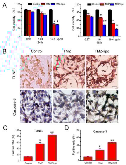 3.2. In Vitro Cytotoxic Effects of TMZ-Lipo on C6 Cells