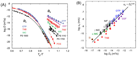 (A) Diffusion coefficient on the surface (Ds) and in the bulk (Dv) of several glass-forming molecular liquids against a Tg-scaled temperature [33]. Reproduced with permission from [33], Royal Society of Chemistry, 2020. (B) Crystal growth rate on the surface us plotted against the surface diffusion coefficient Ds for molecular glasses and amorphous silicon. OTP: ortho-terphenyl. GSF: griseofulvin. TNB: tris-naphthyl benzene. NIF: nifedipine. IMC: indomethacin. POS: posaconazole. PS: polystyrene oligomers [35]. Reproduced with permission from [35], American Chemical Society, 2017.