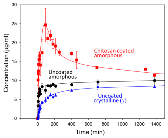 The effect of chitosan coating on the dissolution rate of amorphous IMC particles at 37 °C [41]. Reproduced with permission from [41], American Chemical Society, 2019.