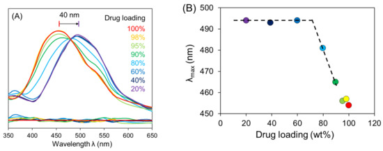 (A) Visible absorption spectra of amorphous CFZ−PAA films at different drug loading. (B) λmax (wavelength of maximal absorption) vs. drug loading. The same color coding is used in (A,B). By extrapolation, the saturation drug loading is determined at 70% [64]. Reproduced with permission from [64], American Chemical Society, 2021.