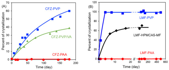 Stability of amorphous drug–polymer salts at 40 °C/75% RH. (A) CFZ−PAA (75% drug loading) [64]. No crystallization was observed in 6 months, while the neutral CFZ−PVP and CFZ−PVP/VA dispersions at the same drug loading both crystallized. Reproduced with permission from [64], American Chemical Society, 2021. (B) LMF–PAA salt (50% drug loading) [65]. No crystallization was observed after 18 months for LMF–PAA, while the neutral LMF−PVP and partially ionized LMF−HPMCAS dispersions at the same drug loading both crystallized. Reproduced with permission from [65], Elsevier, 2021.