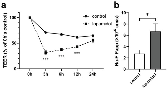 We examined the effect of an iodinated CM. Iopamidol is characterized as a high-osmolar type and contains one benzene ring in the structure; therefore, it is called a monomer. In clinical settings, iopamidol is injected at concentrations of 200–370 mgI/mL. To examine whether short-term exposure of CM affects the barrier integrity, in vitro BBB model (E00 model) was treated with iopamidol (300 mgI/mL) for 30 min. After replacing the CM with a fresh culture medium, TEER was measured. Short-term exposure to iopamidol decreased TEER, compared to the control value at 3, 6, and 12 h time points. This reduction of TEER induced by iopamidol exposure was recovered at 24 h (Figure 1a). Iopamidol also increased the paracellular flux of Na-F, a small water-soluble marker, across the RBEC monolayer at 6 h (Figure 1b). These findings suggested that short-term exposure to iopamidol might increase endothelial permeability and lead to the leakage of CM into the brain parenchyma.