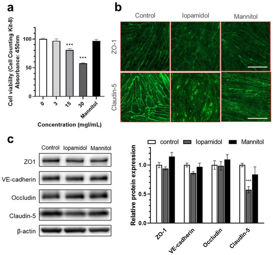 Iopamidol dose-dependently decreased the viability of RBECs measured by CCK-8 assay, whereas mannitol had no effect (Figure 3a). We also investigated whether barrier dysfunction induced by iopamidol is related to the expression change of TJ proteins with immunostaining and Western blotting. Immunostaining revealed that iopamidol (30 mgI/mL) treatment disrupted the continuous, pericellular belt-like pattern of junctional proteins ZO-1 and claudin-5 (Figure 3b). In addition, iopamidol (30 mgI/mL) treatment decreased the expression of the claudin-5 protein, while the expression of occludin, ZO-1, and VE-cadherin TJ proteins remained unchanged (Figure 3c).