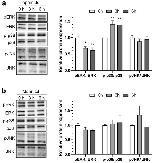 The MAP kinase pathway is activated by various stimuli, such as growth factors, cytokines, oxidative stress, and hyperosmotic stress. Activated MAP kinase affects cellular processes including gene expression, proliferation, and apoptosis. Previous reports indicated that iopamidol influenced the MAP kinase pathway in renal cells and tissues [28,29]. To investigate the possible mechanism of iopamidol-induced barrier dysfunction, expression levels of the total- and phosphorylated-MAP kinase were examined. Following treatment with iopamidol (30 mgI/mL) for 0, 3, and 6 h, phosphorylated MAP components (extracellular signal-regulated kinase 1 and 2 (ERK), c-Jun N-terminal kinase (JNK), p38 mitogen-activated protein kinase (p38)) were detected by Western blot. Iopamidol decreased phosphorylation of ERK and increased p38 phosphorylation in this study (Figure 4a), but there were no notable changes of MAP kinase expression in RBECs treated with mannitol having the same osmolarity (Figure 4b).