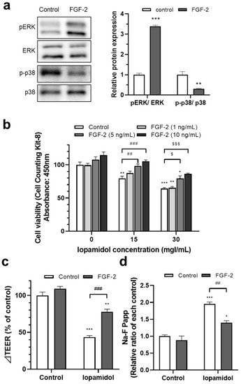 Based on the change of MAP kinase activation induced by iopamidol treatment, we next examined the effects of the regulation of MAP kinase activation on BBB function. It is known that several growth factors regulate the MAP kinase pathway. We examined the effect of FGF-2 on ERK and p38 phosphorylation. FGF-2 (10 ng/mL) treatment for 6 h increased ERK phosphorylation and decreased p38 phosphorylation (Figure 5a). As FGF-2 has a counter-regulatory effect on MAP kinase activation as iopamidol, we examined the effect of FGF-2 on iopamidol-induced BBB dysfunction. To examine the effect of FGF-2 on cell viability in iopamidol-treated RBECs, the cells were treated with iopamidol (15, 30 mgI/mL), in combination with FGF-2 (0–10 ng/mL) luminally for 24 h. Cell viability decreased by Iopamidol was dose-dependently enhanced by FGF-2 treatment (Figure 5b). We also examined the effect of FGF-2 on barrier dysfunction induced by iopamidol. RBECs (E00 model) were treated with iopamidol (30 mgI/mL), with or without FGF-2 (10 ng/mL) for 24 h. FGF-2 partially improved the iopamidol-induced barrier disruption (Figure 5c,d). These findings suggested that iopamidol disrupted the barrier integrity of brain endothelial cells through the MAP kinase pathways.