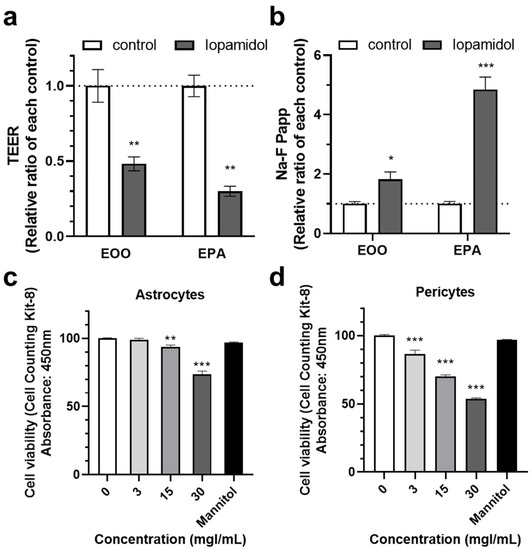 The properties of the BBB are induced and maintained by crosstalk between brain capillary endothelial cells and the neighboring cells along the brain capillary, such as astrocytes and pericytes. Extravasated iopamidol may affect these cells and brain capillary endothelial cells. We hypothesized that iopamidol affects astrocytes and/or pericytes leading to abnormal interaction among these three cell types, which may disturb BBB function. To compare the effect of iopamidol on barrier function between the endothelial monolayer model (E00) and the endothelial–pericyte–astrocyte co-culture model (EPA), the abluminal side of these BBB models were treated with iopamidol (30 mgI/mL) for 24 h. Iopamidol decreased TEER (Actual TEER values; E00 control: 255.2 ± 6.62 (Ω × cm2), E00 iopamidol: 123.7 ± 9.92 (Ω × cm2), EPA control: 439.7 ± 29.41 (Ω × cm2), EPA iopamidol: 131.9 ± 9.26 (Ω × cm2)) and increased the permeability of the BBB to Na-F in both the E00 and EPA models. However, the size of the effect relative to the control was larger in the EPA model (Figure 6a,b). This finding suggested that iopamidol directly affects the activities of astrocytes and/or pericytes, thereby enhancing iopamidol-induced BBB damage. Next, we investigated the effect of iopamidol on the viability of astrocytes and pericytes. Iopamidol dose-dependently decreased the viability in both cell types (Figure 6c,d).