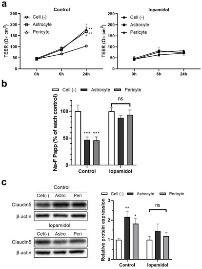 Effects of iopamidol on the astrocyte- or pericyte-induced enhancement of barrier function in rat brain endothelial cells (RBECs). To collect the conditioned medium, cell-free medium, astrocytes, or pericytes were incubated with iopamidol (15 mg/mL) for 36 h. The collected conditioned medium was diluted by 50% with fresh RBEC medium and used to treat RBECs monolayer model for 24 h. Barrier function was evaluated by transendothelial electrical resistance (TEER) (a) and the permeability of the blood–brain barrier (BBB) model to Na-F (b). The ability of astrocytes or pericytes to strengthen BBB barrier function was diminished by exposure to iopamidol. (c) Effect of conditioned medium on claudin-5 expression as examined by Western blotting. The blots are representative images of the experiment. The graph represents the relative expression of claudin-5 (n = 4, two-way ANOVA, p-values were calculated from Dunnett’s multiple comparison test, * p < 0.05, ** p < 0.01, *** p < 0.001, ns = no statistically significant differences).