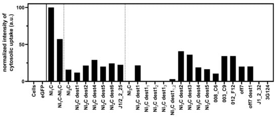 We first set out to investigate the translocation potential of a set of DARPins. Confirming earlier observations, the consensus DARPins with one and two internal repeats, as well as mutations of the latter, get translocated to the cytosol (Figure 1, Figures S1a–j and S2a–e). An LFN fusion construct designed with two identical NI1C DARPins in tandem, LFN-NI1C-NI1C, also showed cytosolic delivery. The consensus DARPin with three internal repeats does not show a signal for cytosolic localization, while destabilizing mutations (NI3C dest1–5) restore efficient translocation, as shown previously []. The location of the destabilizing mutations is listed for convenience in Table 1 and Figure S3a,b.