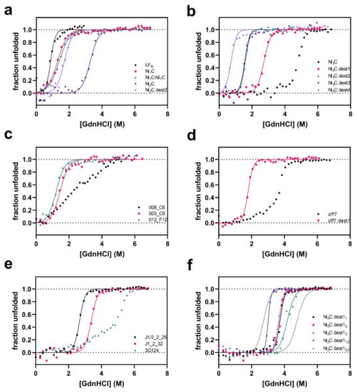 GdnHCl-induced equilibrium unfolding of various cargo DARPins in PBS (pH 7.4) at 20 °C, analyzed by CD spectroscopy. Curves represent a fit to Equation (1). (a) LFN and the consensus DARPins NI1C, NI1C-NI1C, NI2C, and NI2C dest2; (b) NI3C consensus DARPin and mutated variants of it (NI3C dest1–4); (c) target-selected LoopDARPins; (d) MBP-binding DARPin off7 and a destabilized off7 variant; (e) JNK-binding DARPins and eGFP-binding DARPin 3G124; (f) NI3C dest1 variants with repeat-specific mutations: dashed lines represent NI3C with no mutations (right) and NI3C dest1 with all mutations (left). Destabilizing mutations (dest1–4) have been described before [], and their location is listed in Table 1.