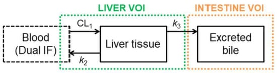 The main difference between the already published liver model [28] and the one used in this study is related to the implementation of the input function. In the present study, the input function used was the mathematically estimated blood concentration-time curve, while the previous model used the amount of radioactivity in the hepatic sinusoids as an input function (by multiplying the mathematically estimated blood concentration curve by the volume occupied by the hepatic sinusoids—approximately 25% of the liver volume). This change leads to a different PK parameter defining the radioactivity uptake, CL1 (mL/min) instead of k1 (min−1) [28].