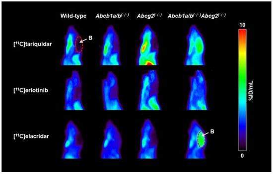 The adenosine triphosphate-binding cassette (ABC) transporters P-glycoprotein (P-gp, encoded in humans by the ABCB1 gene and in rodents by the Abcb1a and Abcb1b genes, and breast cancer resistance protein (BCRP, encoded in humans by the ABCG2 gene and in rodents by the Abcg2 gene) are two important efflux transporters that are widely expressed throughout the body [1]. These two membrane transporters have a broad and largely overlapping substrate spectrum, including a variety of clinically used drugs, such as most molecularly targeted anticancer drugs [2,3]. At the luminal membrane of brain capillary endothelial cells, which form the blood–brain barrier (BBB), P-gp and BCRP play a vital defense role by limiting the distribution of their substrates into the brain by efflux transport from the endothelial cells back into the blood [4]. Several studies have provided evidence for functional redundancy between P-gp and BCRP in limiting the brain distribution of dual P-gp/BCRP substrates [2,3,4,5,6]. In absence of either P-gp alone or BCRP alone, the remaining transport capacity of the other transporter usually suffices to restrict the brain access of dual substrates so that dual P-gp/BCRP substrates only gain unrestricted brain access when both transporters are absent or inhibited [4]. Using individual and combined Abcb1a/b and Abcg2 knockout mice, this functional redundancy between P-gp and BCRP at the BBB has been demonstrated for several dual P-gp/BCRP substrates, such as lapatinib, erlotinib, flavopiridol, and mitoxantrone [5,6]. There is also evidence that a similar functional redundancy between P-gp and BCRP exists at the human BBB [7]. In addition, P-gp and BCRP may become overexpressed in certain tumors, in which they can contribute to multidrug resistance by limiting cellular entry of anticancer drugs [8].