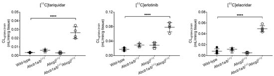 Initial brain uptake clearance (CLuptake,brain) of [11C]tariquidar, [11C]erlotinib, and [11C]elacridar determined with integration plot analysis in wild-type, Abcb1a/b(−/−), Abcg2(−/−), and Abcb1a/b(−/−)Abcg2(−/−) mice. **** p ≤ 0.0001, one-way ANOVA followed by a Dunnett’s multiple comparison test against the reference group (wild-type).