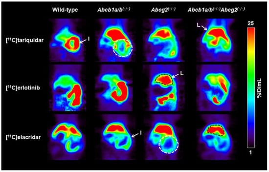 Coronal PET summation images (0–60 min) of the abdominal region obtained after i.v. injection of either [11C]tariquidar, [11C]erlotinib, or [11C]elacridar in one representative wild-type, Abcb1a/b(−/−), Abcg2(−/−), and Abcb1a/b(−/−)Abcg2(−/−) mouse. Radioactivity concentration is expressed as percent of injected dose per milliliter (%ID/mL). Anatomical structures are labeled with white arrows and colored dashed-line areas (I: intestine, white; L: liver, black).
