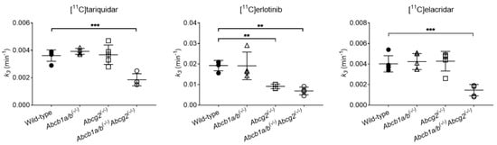 Rate constant (k3) representing the transfer of radioactivity from liver to excreted bile (intestinal region of interest) obtained with the compartmental model for [11C]tariquidar, [11C]erlotinib, and [11C]elacridar in wild-type, Abcb1a/b(−/−), Abcg2(−/−), and Abcb1a/b(−/−)Abcg2(−/−) mice. ** p ≤ 0.01, *** p ≤ 0.001, one-way ANOVA followed by a Dunnett’s multiple comparison test against the reference group (wild-type).
