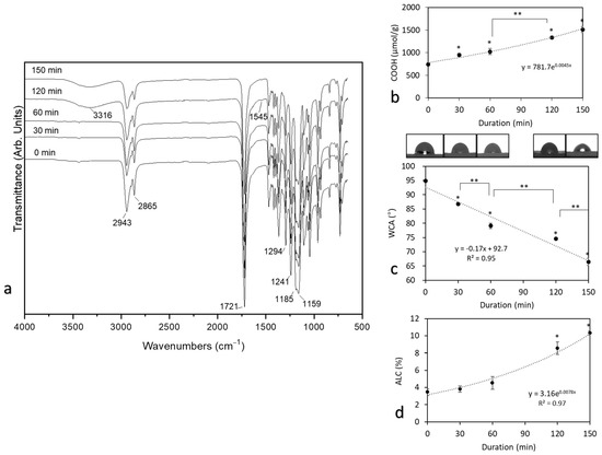 - Can-Herrera, L.A.; Ávila-Ortega, A.; de la Rosa-García, S.; Oliva, A.I.; Cauich-Rodríguez, J.V.; Cervantes-Uc, J.M. Surface modification of electrospun polycaprolactone microfibers by air plasma treatment: Effect of plasma power and treatment time. Eur. Polym. J. 2016, 84, 502–513. [Google Scholar] [CrossRef]