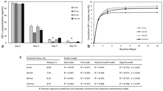 - Mullen, L.M.; Best, S.M.; Brooks, R.A.; Ghose, S.; Gwynne, J.H.; Wardale, J.; Rushton, N.; Cameron, R.E. Binding and release characteristics of insulin-like growth factor-1 from a collagen-glycosaminoglycan scaffold. Tissue Eng. Part C Methods 2010, 16, 1439–1448. [Google Scholar] [CrossRef] [Green Version]