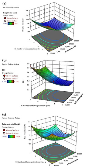 where (a) and (b) are the pressure and number of homogenization cycles, respectively. The model p-value of Equations (6)–(8) after elimination of insignificant interaction term of pressure and number of homogenization cycles (a × b) (p-values > 0.05), were statistically significant at a p-value < 0.0001. They implied that there was less than a 0.01% chance that the F-ratios of these equations occurred from noise. The Adj-R2 values of Equations (6)–(8) were 0.9947, 0.9911 and 0.9676 respectively. These satisfied Adj-R2 values suggested that the obtained quadratic models could explain 99.47%, 99.11% and 96.76% for variability of droplet size, PDI and zeta potential, respectively, from changes of the values of pressure and number of homogenization cycles.