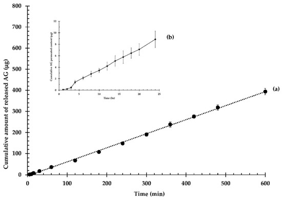In vitro release profile and skin permeation of AG from Op-AG-NE: (a) cumulative amount of released AG and (b) cumulative AG permeated content (mean ± SD, n = 3).