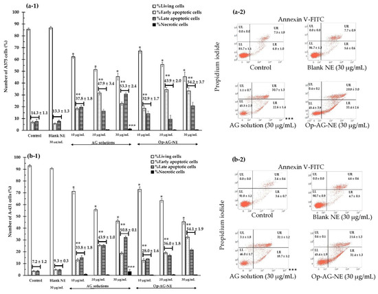 The number of living cells (Annexin V-FITC-, PI-: LL) of the A375 cells and A-431 cells incubated with AG solution and Op-AG-NE are illustrated in Figure 6(a-1,b-1). They were significantly lower than that of the controls and that of the cells incubated with Blank NE (30 µg/mL) (p-values = 0.000 for all comparisons). Furthermore, they were markedly decreased when the equivalent concentrations of these test samples were increased. The findings indicated that the higher the equivalent concentrations of AG (in AG solution and Op-AG-NE), the higher the cytotoxic effect on both skin cancer cells. The results were consistent with the number of total apoptotic cells of the A375 cells and A-431 cells estimated by summation of numbers of the early apoptotic cells (Annexin V-FITC+, PI-: LR) and that of the late apoptotic cells (Annexin V-FITC+, PI+: UR). Their total numbers of apoptotic cells were much greater than that of the controls and the cells incubated with Blank NE (30 µg/mL) (p-values = 0.000 for all comparisons), and were much higher when the equivalent concentrations of the test samples were increased. They pointed out that the apoptosis induction activity of the AG solution and Op-AG-NE in the A375 and A-431 cells were in a dose-dependent manner.