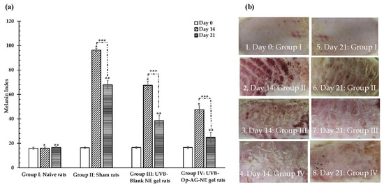 (a) Melanin Index (mean ± SD, n = 10) and (b) macroscopic skin appearance of the UVB-exposed rats’ skin (*, ** and *** were significantly different at a p-value < 0.05).