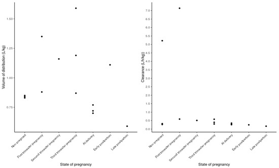 - Pariente, G.; Leibson, T.; Carls, A.; Adams-Webber, T.; Ito, S.; Koren, G. Pregnancy-Associated Changes in Pharmacokinetics: A Systematic Review. PLOS Med. 2016, 13, e1002160. [Google Scholar] [CrossRef] [PubMed]